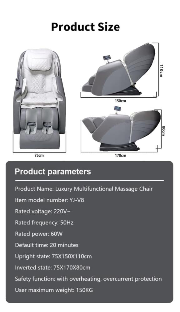 - لوحة تحكم جانبية لتشغيل الكرسي والتحكم بزاوية الاسترخاء والتحكم بطول مساج الاقدام